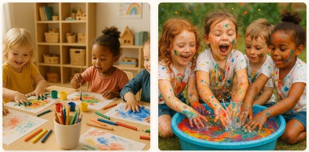 Bei wiederkehrendem Interesse starten wir kleine Projekte, etwa zu den Jahreszeiten, zu Tieren oder passend zu unserem Namen „Häuschen‑Kunterbunt“ zum Thema Farben. So entstehen gemeinsam Geschichten, Lieder und Kunstwerke, die die Kinder stolz mit nach Hause nehmen.